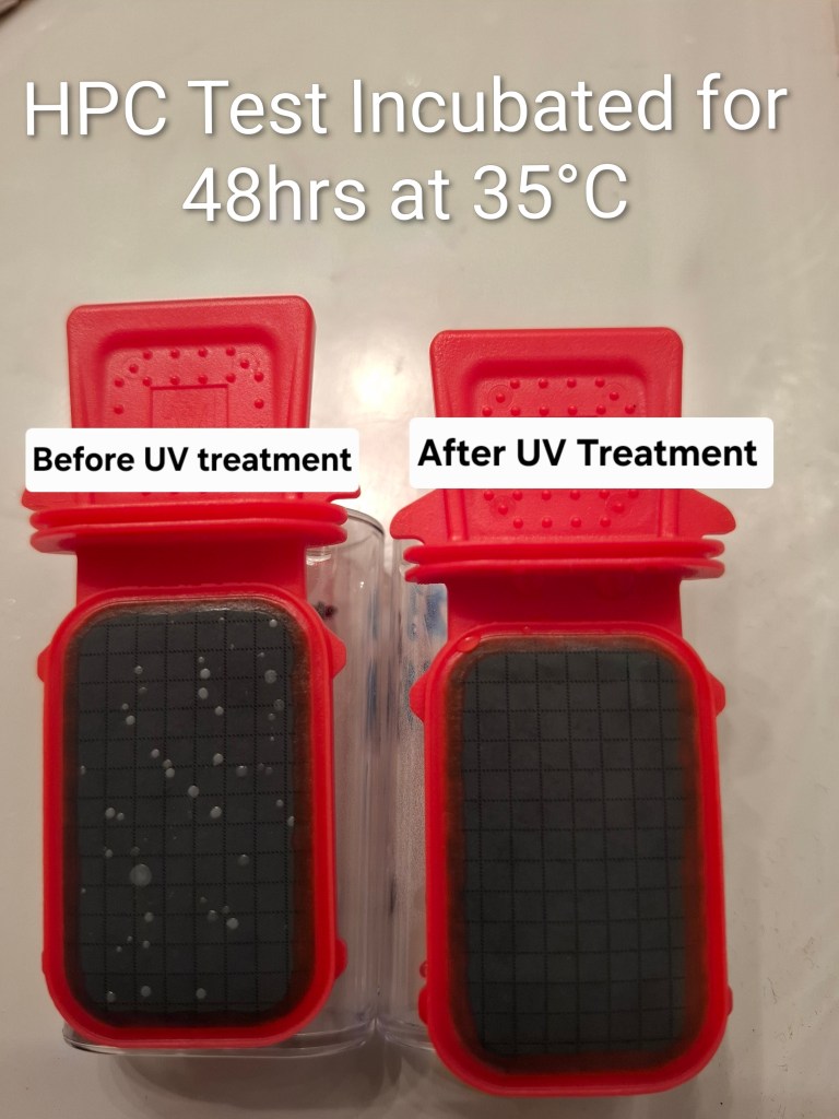 The image illustrates bacteria growth results from a customer’s water source, with untreated water showing colonies on the left and no colonies after UV treatment on the right. This contrast highlights the effectiveness of the UV treatment process. HPC tests, or heterotrophic plate count tests, assess water contamination levels without identifying specific bacteria types, which makes them common in dental practices to evaluate sanitization effectiveness. These tests are essential in providing valuable insights into the overall microbial load present in the water supply if it be upstream or downstream.